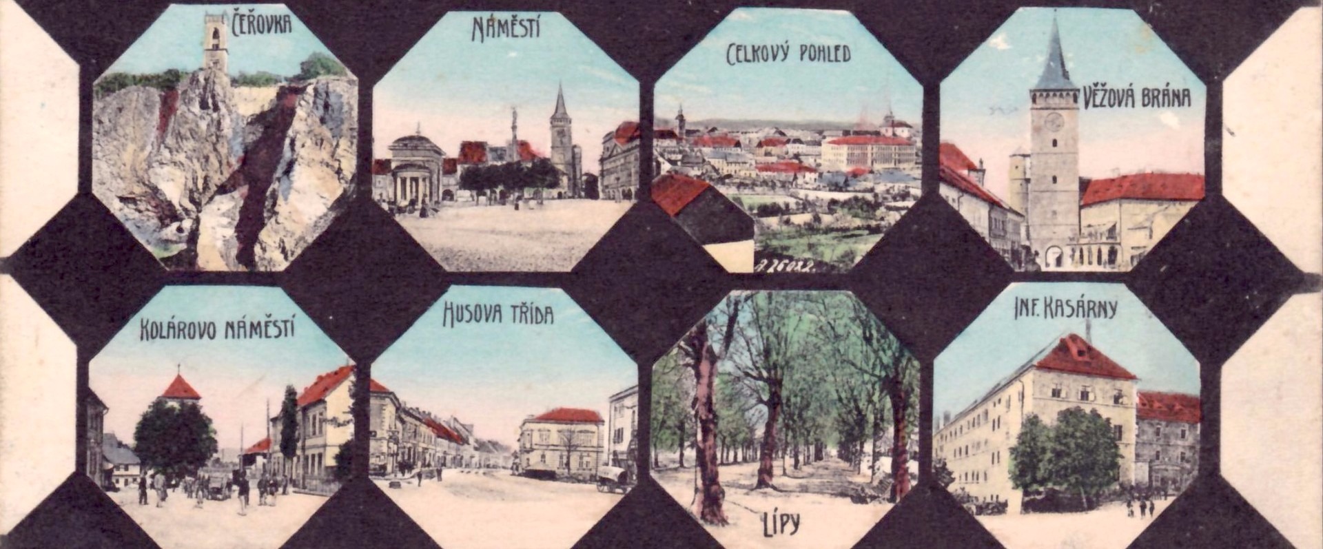 │POZDRAV Z JIČÍNA ČEŘOVKA NÁMĚSTÍ CELKOVÝ POHLED VĚŽOVÁ BRÁNA KOLÁROVO NÁMĚSTÍ HUSOVA TŘÍDA LÍPY INF. KASÁRNY ║DOPISNICE Kubova tržnice dopisnic v Jičíně, Husova třída č. 52 (zeleně) ● barevná, montáž 8 osmiúhelníkových snímků na bílém podkladu, mezi nimi černé čtverce nakoso