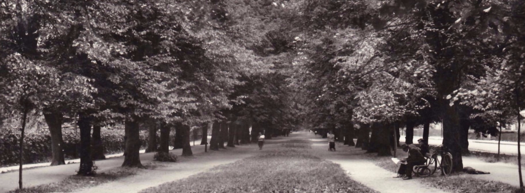 │bez textu ║JIČÍN. Lipové stromořadí. Nákl. Josef Zajíček, knihkupectví, Jičín. B 81/1 624 ● černá, s bílým rámečkem, stejný záběr jako u č. 1816/a, průhled středem lipové aleje, vpravo u stromu sedí na lavičce dva muži, o strom opřené kolo, na cestě leží pes, v pozadí žena s kočárkem
