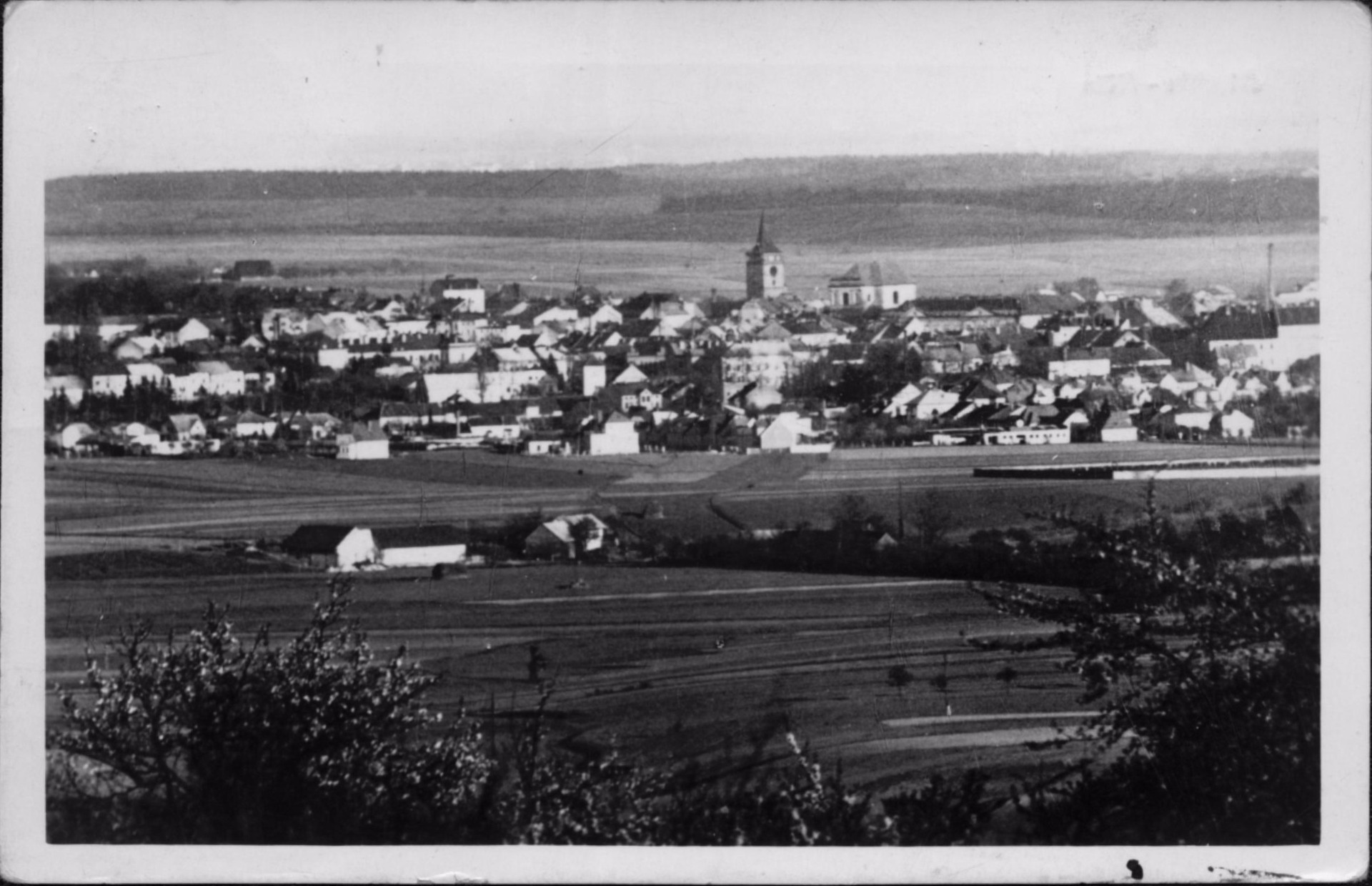 │bez textu ║JIČÍN. Grafo Čuda Holice. ● foto, černá, pohled z Prachova, uprostřed snímku dominuje brána a kostel sv. Jakuba, v popředí uprostřed koruna stromu, bílý rámeček [H, U]