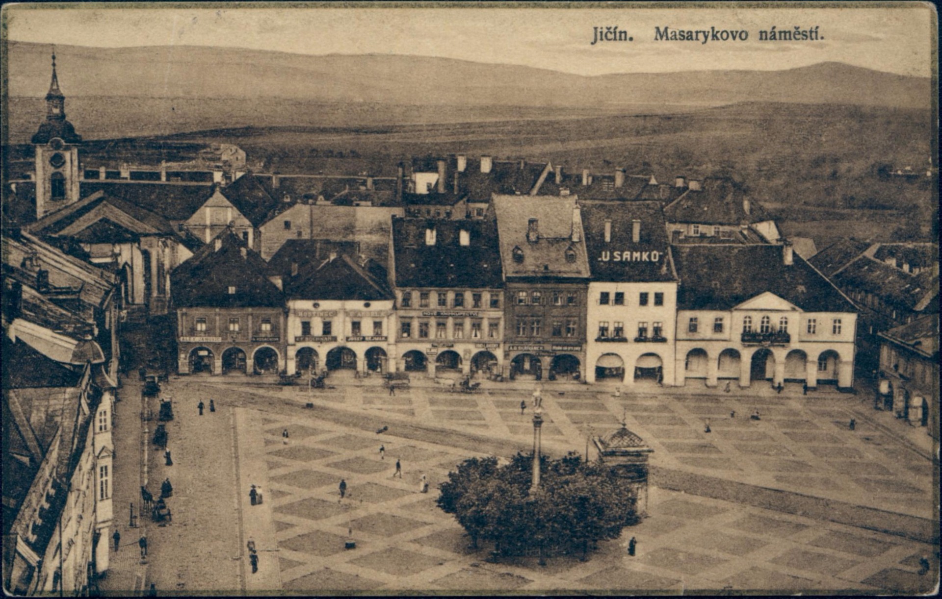 │Jičín. Náměstí. ║É J.M.P. 21223 - 1922 HFNS (hnědě) ● sépiová, stejný záběr jako u č. 0816, pohled z věže na celou západní stranu, část jižní a malou část severní strany, vlevo věž kostela sv. Ignáce, spodní část náměstí oříznuta již u stromů