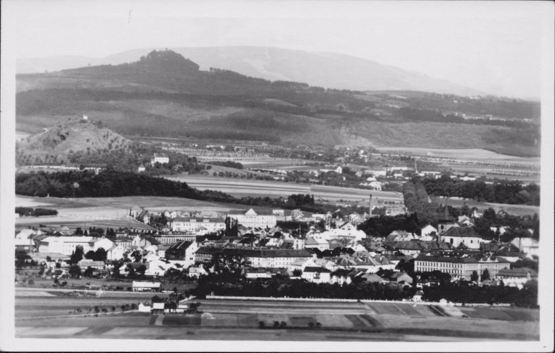 │bez textu ║Jičín. GRAFO ČUDA HOLICE v Č. ● foto, černá, bílý rámeček, stejný záběr jako u č. 1351, celkový pohled z Veliše na část města, vpravo I. ZŠ, vlevo Čeřovka, Zebín, nad ním Kumburk [H]
